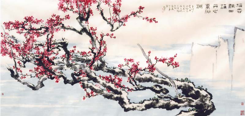 这幅《梅香飘四海 丹心禀神州》长5米,高2.4米,今年7月初开始创作,10月下旬完成,是沈光伟教授迄今以来创作的最大尺幅作品。作品纯粹以红梅为创作素材,仅略染云烟和远山,在如此巨幅作品中用单一元素创作比较少见,具有很大的难度。沈光伟教授曾言,“治艺之道源自生命的感动和艺术家的情怀,源自一生中永不忘却的惦念。”这幅红梅灼热如火,奇异纵横,突出了红梅“不屈不挠之性格品质和意志”,充分表达和体现了作者“国魂、画魂、人魂”相统一的艺术追求。