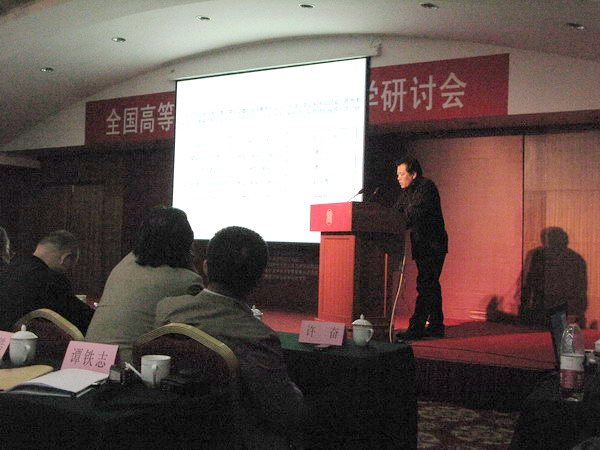 我校唐鸣岳教授在研讨会上介绍我校壁画专业的教学、科研和创作情况