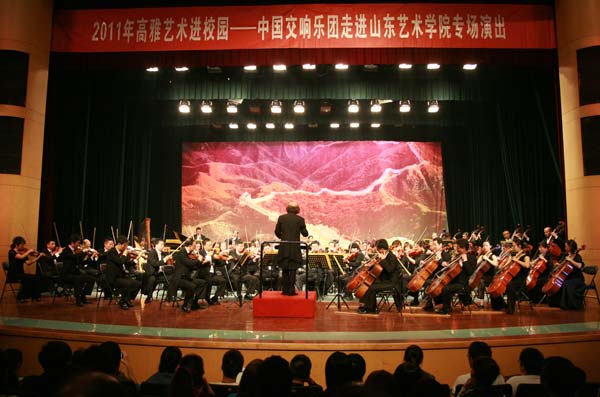 10月8日下午1点30分,由教育部、文化部、财政部联合主办的“高雅艺术进校园”——中国国家交响乐团走进山东艺术学院专场演出在我校文东校区艺术剧场举行。我校党委书记任运河、副院长郭跃进,中国国家交响乐团副团长许树滋、山东省教育厅体卫艺处正处级调研员张德珠、中国国家交响乐团事业发展部主任朱小秋、山东青年政治学院纪委书记化旭、山东青年政治学院副院长李章泉等领导与我校师生、社会各界观众800余人,一同欣赏了这场由中国国家交响乐团乐队首席刘云志先生和特邀指挥陈燮阳先生带领中国国家交响乐团奉献的精彩视听盛宴。