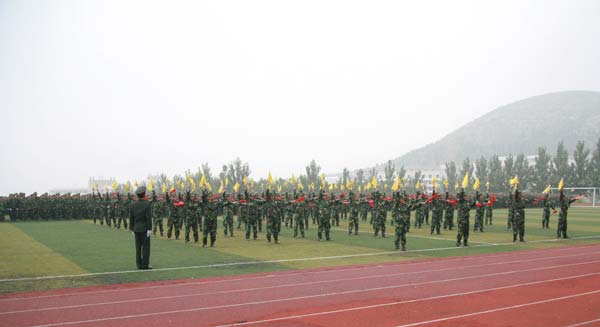 开学典礼在雄壮的国歌声和庄严的升国旗仪式中拉开了帷幕。院长张志民同志检阅了受训方队。在山东艺术学院军训团团旗的引导下,由2000多名新生组成的32个学生方队,依次通过主席台接受检阅。同学们嘹亮的口号、整齐的步伐和威武的军姿展示了军训成果。分列式后举行的队列表演、军体拳和旗语操表演将军训汇报表演推向了高潮。同学们刚劲的步伐、嘹亮的口号、整齐的动作、饱满的热情、高昂的气势,展现了良好的军事素养与精神面貌,博得在场观众阵阵掌声。