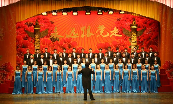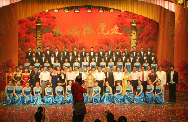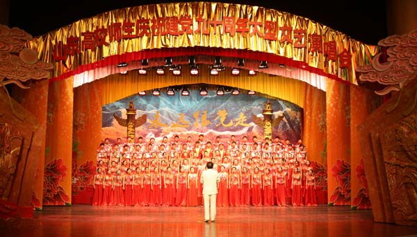 6月17日晚,全省高校师生代表相聚山东艺术学院文东校区艺术剧场,举行山东高校师生庆祝建党九十周年大型文艺演唱会。山东省人民政府副省长黄胜,山东省人民政府副秘书长司安民,中共山东省委宣传部副部长黄泽存,中共山东省纪委第二纪检监察室主任司家军,中共山东省委高校工委副书记齐秀生,山东省教育厅党组副书记、副厅长张兴民,中共山东省委高校工委副书记黄琦,中共山东省委高校工委副书记傅华峰,中共山东省委高校工委副书记邢善萍,山东省教育厅副厅长宋承祥,中共山东省高校纪工委书记张圣中,山东艺术学院党委书记柳文敏、院长张志民,副院长郭跃进、王力克、刘晓静与全省高校师生代表一同观看演唱会。