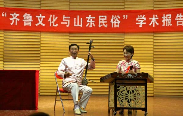 报告会还结合齐鲁文化和山东民俗特点,邀请我省著名表演艺术家适时穿插现场表演,将我省国家级非物质文化遗产保护项目五音戏、山东琴书、泰山皮影戏搬上了学院舞台。国家级演员、“非遗”传承人、淄博市五音戏剧院的吕凤琴、秦建萍表演的《王小赶脚》片段,国家级演员、“非遗”传承人、济南市曲艺团的姚忠贤、杨珀师徒表演的琴书《反正话》,国家级“非遗”泰山皮影戏传承人范正安表演的《泰山石敢当》,都以精湛的演技、活泼的表演把现场气氛推向了高潮,赢得了阵阵掌声。