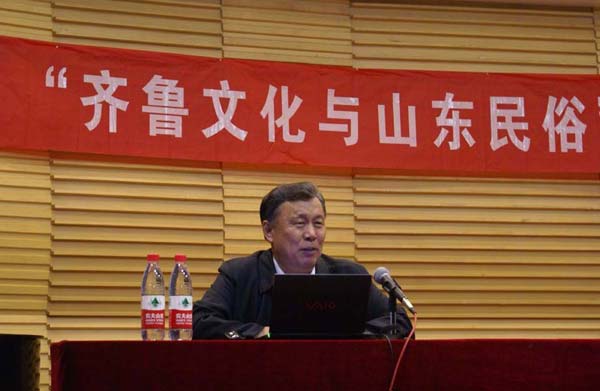 本场报告会是我校“齐鲁大讲坛·文化艺术分坛”参加“2011年山东省社会科学普及周”活动的系列讲座之首场讲座。报告会以讲座穿插我省“非遗”演艺项目表演的形式,赢得了广大师生的欢迎。讲座集中阐述了四个问题:一、齐鲁文化与山东民俗的关系——相互影响、双向互动:二、齐鲁文化与山东民俗概况——底蕴深厚、丰富多彩:三、齐鲁文化对山东人习俗礼仪的影响——深入灵魂、传承久远:四、齐鲁文化与山东民俗的缺憾——守成有余、创新不足。作为山东民俗学会会长和我校非物质文化遗产专业特聘研究生导师的刘德龙研究员,以诙谐多样的语言、广采博收的知识、生动丰富的实例,将齐鲁文化的博大内涵和山东民俗的多彩风貌一一道来,博得了同学们的阵阵掌声。