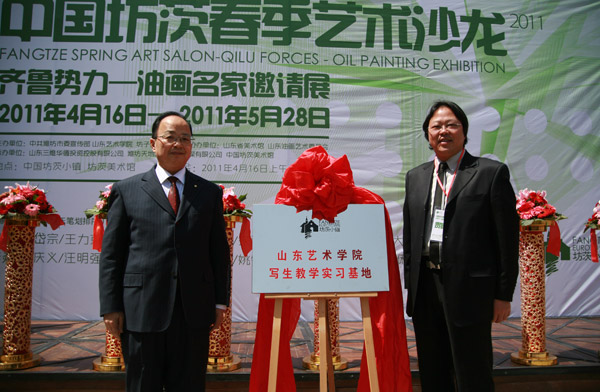 开幕式上,坊茨小镇被确定为我校写生教学实习基地。潍坊市人大常委会副主任杨继生与王力克副院长共同为“山东艺术学院写生教学实习基地”揭牌。
