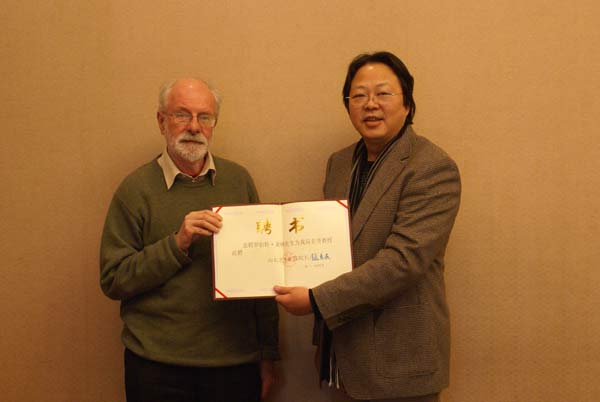 4月2日晚,王力克副院长代表张志民院长在学林大酒店设宴,款待应邀前来我校参加 “齐鲁大讲坛·文化艺术分坛”讲座活动的英国著名人类学家罗伯特·莱顿教授,并向莱顿先生颁发了聘请他担任我校名誉教授的聘书。