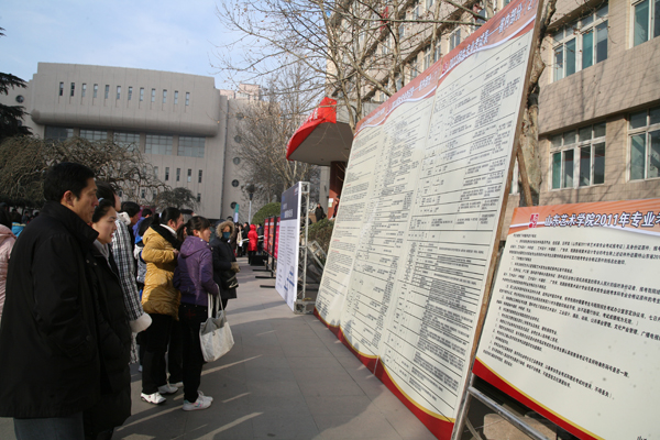 2月12日上午,山东艺术学院2011年招生报名工作在我校文东校区正式开始。清晨,很多考生和家长一早便来到我校报名地点,在这里排起了长队等待报名。报名工作开始前,学校已在校园主路及建筑上挂出了“欢迎广大考生报考山东艺术学院”、“走进艺术殿堂,成就艺术人生”等横幅,在报名现场安放了学院简介、指导考生报名的流程图、各专业报名考试时间等醒目的指示牌,营造出了浓厚的招生考试工作的氛围,为考生及家长及时了解学院、了解整个报名考试工作的详细安排提供便利。各二级学院都在学院广场上设立了报名咨询处,安排了负责引导的工作人员,为考生和家长提供信息咨询、报名引导等服务。各有关部门鼎力配合,做好了保卫、班车、医疗等各项后勤保障工作。