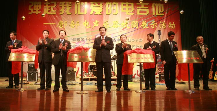 在三楼艺术剧场,王军民副省长与出席活动的领导一起为“山东艺术学院音乐学院实践教学基地”、“山东艺术学院音乐学院、中国电声乐器产业基地(鄌郚镇)产学研结合基地”等揭牌,并代表参展电声企业向我校音乐学院及山东大学艺术学院、山东师范大学音乐学院赠送了高级电吉他和电贝司等乐器。