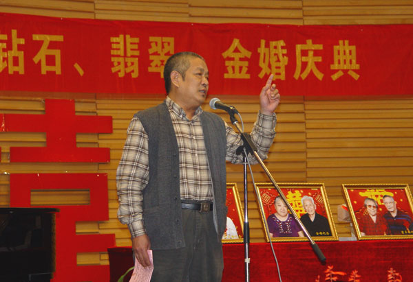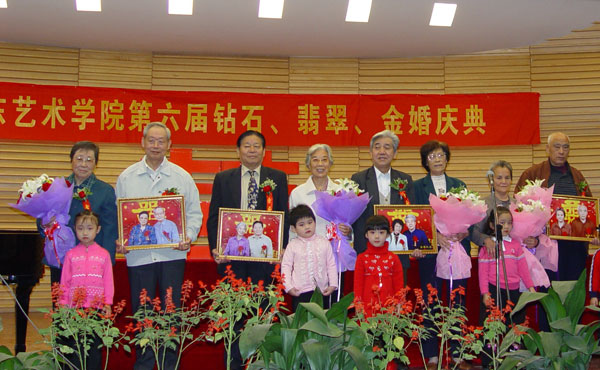 仪式上,张志民院长代表学院党委、行政向全体离退休老同志表示节日的问候,并向风雨同舟50年的10对钻石、翡翠、金婚伉俪赠送了结婚纪念照片,并与老同志们合影留念。老干部张遥老师代表婚庆夫妇回顾了相濡以沫50年的感情历程,并对学院给予老同志的关心和爱护表示衷心感谢;身穿节日盛装的幼儿园小朋友为爷爷奶奶们献上了象征爱情的玫瑰花;音乐教育学院吴鹰老师代表在职教职工向老同志表示节日祝贺并献上优美动听的歌曲。庆典仪式在我校老年合唱团等老年艺术家们的精彩演出中圆满结束。