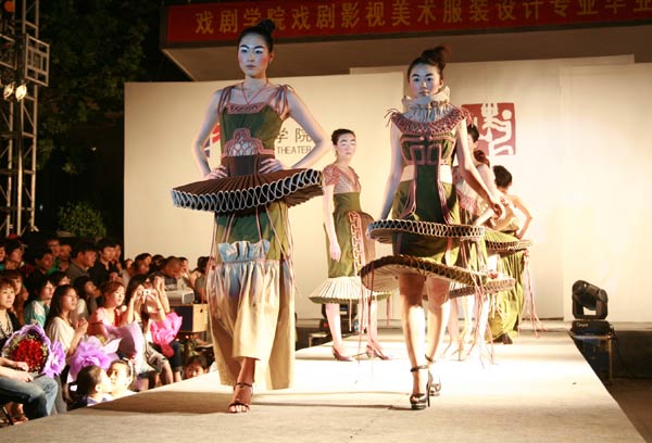 汇报表演展出作品都是同学们在对影视服装设计进行了四年的系统学习、实践后精心创作而成的。作品的裁剪、缝制也都是同学们亲手完成的。设计制作过程中,同学们在追求服饰的艺术品味与时尚个性的同时,还注重了对新材料、环保材料的运用,注重了作品艺术性与实用性的统一。