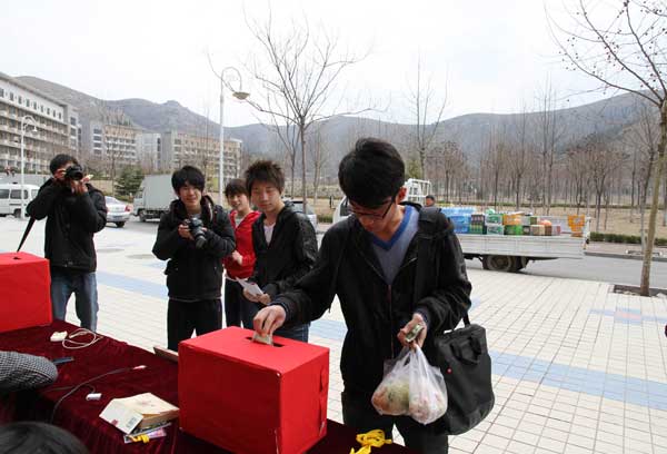 一方有难,八方支援。我校团委带领学生会的学生干部以最快的速度安排好捐款事宜。此次活动也得到了同学们的积极响应,大家纷纷涌向募捐现场,怀着一颗真诚的爱心把钱投向募捐箱。截止到3月30日中午,共筹到捐款 1508元,值得一提的是,戏剧学院09级导演班的一名同学单独捐款300元。一元一分总关情,一点一滴皆心意,同学们用自己的行动向灾区人民表达着他们的祝福。活动结束后,这些善款将以我校的名义捐献给西南灾区,表达我校学子的一片爱心和深深祝福。