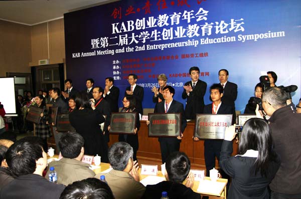 为做好KAB创业教育项目2009年度总结工作,进一步促进青年创业教育领域的经验交流,推动大学生创业教育的发展,3月26日至27日,共青团中央、全国青联、国际劳工组织在京共同举办 “KAB创业教育2009年会暨第二届大学生创业教育论坛”。团中央书记处书记卢雍政、学校部部长及副部长、国际联络部、国际劳工组织、中国青年报社等部门及来自全国130多所院校的领导、创业教育专家参会。我校被授予“大学生KAB创业教育基地”称号。