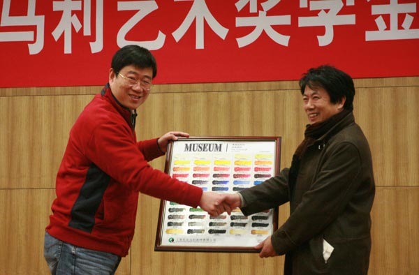 仪式开始前,工作人员播放了介绍马利公司90年发展历程的短片,展现了一个民族企业近百年的辉煌和进取之路,使同学们对手中朝夕相处的画笔和颜料有了更深刻的了解。接着,王力克副院长做了热情洋溢的讲话。他深情回顾了自己由小学、中学、大学到工作后手中画笔材料的变化,表达了对马利公司的感谢和对同学们再创佳绩的殷切希望。