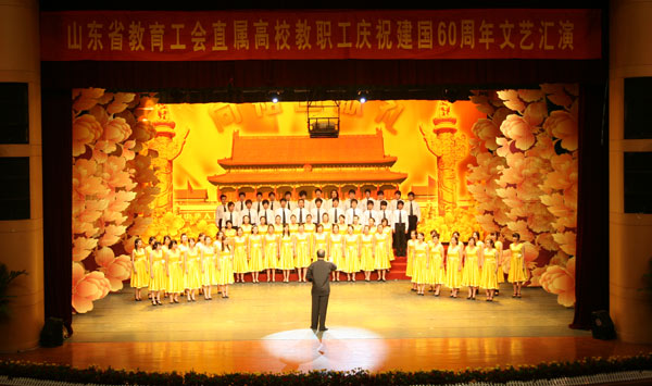 9月20日晚,山东省教育工会直属高校教职工庆祝新中国成立六十周年文艺汇演在我校文东校区艺术剧场举行。省总工会常务副主席吕明辰,省总工会副主席齐太生,山东省教育厅副厅长杨瑛,山东教育电视台台长刘锦瑜,山东省教育工会主席李崇岗,我校党委书记柳文敏,党委副书记朱德强,副院长郭跃进、王力克、刘晓静以及各高校分管领导、工会主席与广大师生一同观看了演出。