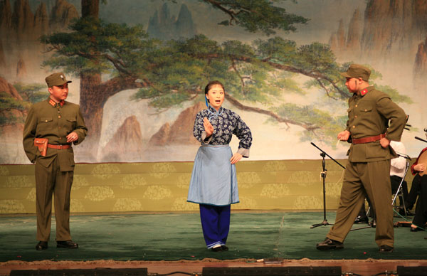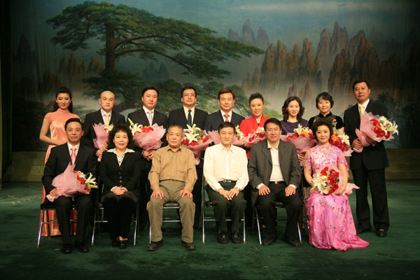 演出在全体演员《甘洒热血写春秋》的激昂唱腔中落下帷幕。结束后,院领导走上台与演员们一一握手,对他们的精彩表演表示感谢,并合影留念。