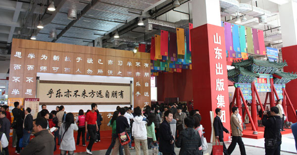 山东展区以暖色为基调,巧妙的借用了场地内的圆柱,以我国最早的图书形态“竹简”与《论语》中的经典词句作为展区外沿的表现形态,通过对诸多设计元素的运用,表现出了我国从右往左的古老书写方式,同时也揭示出了孔子的学说以书的形式传承至今和“开卷有益”的深刻文化意韵;并通过对阙里牌坊、孔子雕像、杏坛讲学、竹简和《论语》等文化元素的有机整合,传达出了“儒家文化”的核心内涵。同时,文化核心展示区与出版图书展示区互为融合、交相辉映,使读者亲临于书简之内,遨游于文化之间,充分展现了齐鲁文脉、华夏书香的独特魅力,形成了书博会上一道独特的风景线。