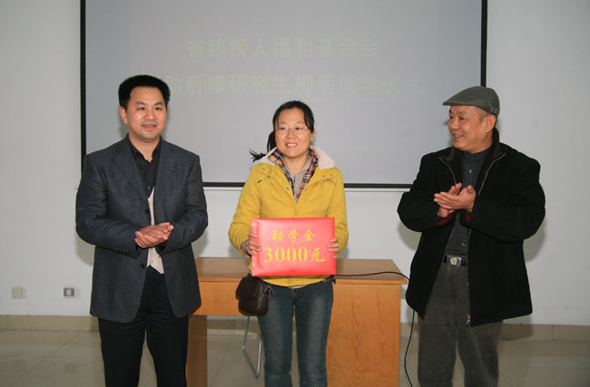 张志超副理事长简要介绍了省残疾人福利基金会的情况,他向关心支持残疾人事业的学院领导、师生表示感谢,对柳俏同学自强不息、奋发向上的精神进行了高度赞扬。他代表省残疾人福利基金会向柳俏同学颁发了3000元的助学金,并勉励柳俏同学以后更乐观向上地面对生活,在学业上更上一层楼。