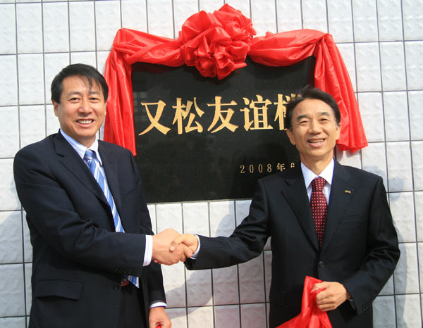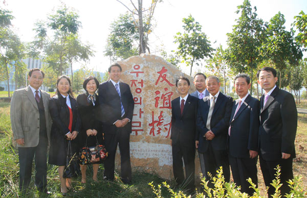 离开又松友谊楼,金圣经理事长一行和我院领导来到办公楼前,在又松大学为庆祝我院新校区启用捐赠的友谊树前合影留念。