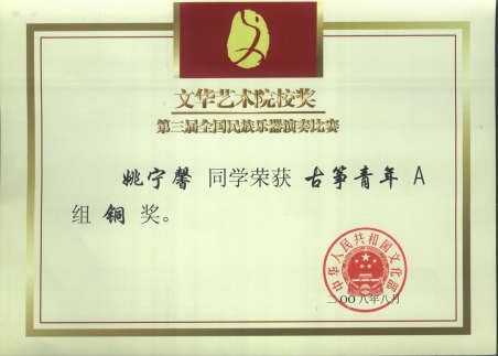 第三届全国民族乐器演奏比赛是本次奖项评比的重要赛事,由中华人民共和国文化部主办,中国民族管弦乐学会、文化部民族民间文艺发展中心和西安音乐学院联合承办。该项赛事的评委由国内各艺术院校、院团的著名民乐理论家、演奏家、指挥家和作曲家担任,参选者要经过初赛、复赛、决赛激烈的角逐方可能获奖,获奖者由文化部颁发获奖证书,均代表了各自专业领域的顶尖水平。比赛中共有来自全国各地149个单位的598名选手参与了各个奖项的竞争。姚宁馨老师在这一强手如林的赛事中稳定发挥,终于以优异的成绩获得古筝青年专业组铜奖。