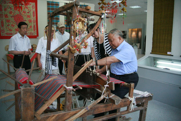 熟悉鲁锦艺术的王修智副主席在织布机上为大家演示鲁锦织造过程。