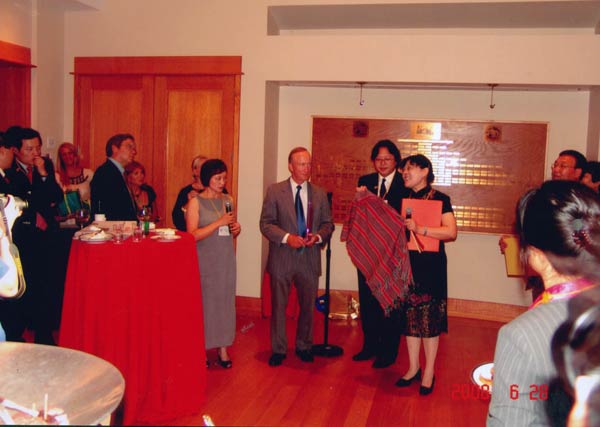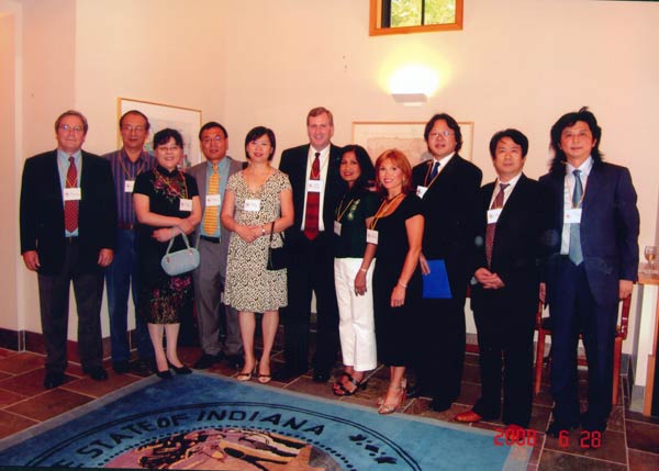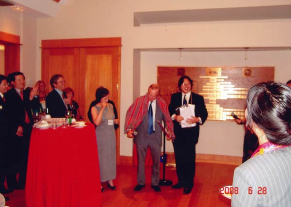 印地安那州州政府非常重视此次艺术交流活动,6月27日晚,印地安那州州长丹尼尔斯以西方人的最高礼遇,特别举行家庭晚宴,并邀请驻芝加哥中国副总领事、本州议员、波利斯市市长柏拉德及各界名流出席,盛情欢迎来自孔子故乡的我院艺术交流团一行。州长和王力克团长分别致词,热情赞美“孔子故乡的艺术”来此间交流的盛举。在展览开幕式上,波利斯市市长还郑重地将城市金钥匙授予王力克团长,表示从今波利斯市将向山东艺术学院敞开大门,欢迎常来举办艺术交流活动,以促进艺术交流和友谊。