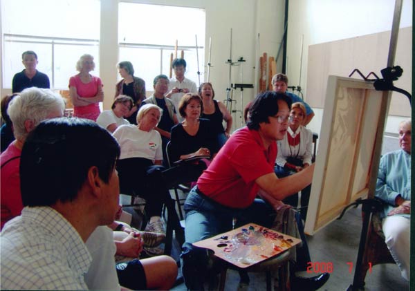 由于印地安那州政府的重视,使这次展览交流活动的意义远远超出了它自身的价值。我院艺术交流团抵达的第一天,就在州长官邸举行了“两个世界一种语言——艺术”的学术研讨会。出席研讨会的,除我院艺术交流团全体成员和印地安那波利斯艺术中心的有关人士外,还有该州议员、前任市长、艺术和体育方面的官方负责人、州立大学艺术学院院长和媒体界人士等共三十多人。研讨会由该州资深文化官员主持,研讨内容包括“艺术院校对本地经济的影响”、“艺术教育对改变未来劳动力结构的影响”、“政府和企业对艺术教育投资的情况”等。研讨会上,王力克副院长就我院的办学情况和中国艺术教育的形势发展对策,毛岱宗教授就中国当前素质教育的政策及艺术教育作用的转型等问题分别做了阐释。期间,双方讨论认真深入,彼此受益良多。除了对方组织的学术研讨会以外,交流团成员还在艺术中心先后作了关于中国写意绘画、中国书法、中国油画艺术方面的学术讲座,并进行了现场演示。这些学术活动,对于加强彼此的沟通与了解,尤其是对于加深美国人民对中国文化与艺术的了解是非常有意义的。