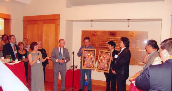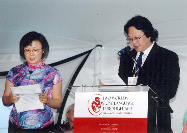 此次展览的开幕式,完全变成了一场隆重热烈的“中国艺术秀”。展厅外面的长廊里悬挂着一盏盏中国灯笼,树上缀满了充满中国吉庆色彩的红丝带。开幕式没有采用传统的剪彩形式,而是别开生面,邀请当地华人社团以舞龙表演的方式为展览揭幕,接着是鸡尾酒会、晚宴、中国文艺节目演出、燃放礼花,整个开幕仪式从晚上七点一直持续到十点半。前来参加活动的各界嘉宾共计五百多人,期间各界人士纷纷发表讲话盛赞此次艺术交流活动,中国驻芝加哥副总领事储茂明和王力克团长也分别发表热情洋溢的讲话,介绍来自孔子故乡的当代绘画艺术。