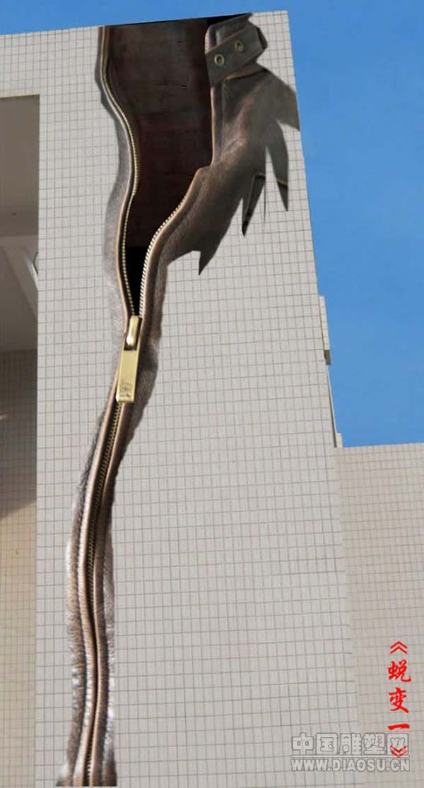 雕塑作品《蜕变一》材料为铜和拉链,高21米,宽4米。邱发文同学在谈到创作的出发点时说,“每当我走出校园时,看到不少整个整个的墙面,感觉太板了,如果想破一下,打破这种环境,本身就是充满活力的。”