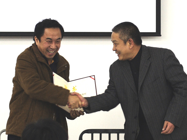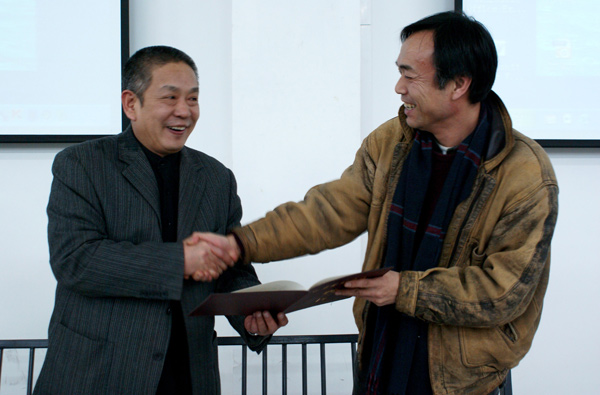 1月10日,著名摄影家解海龙、著名摄影理论家鲍昆来到我院长清新校区,在设计学院多媒体教室分别作了《希望工程照片背后的故事》、《当代影像艺术状态》学术讲座,并被受聘为我院客座教授,院长张志民为两位摄影家颁发聘书,副院长胡德定参加了受聘仪式,设计学院院长刘玉泉主持受聘仪式。
