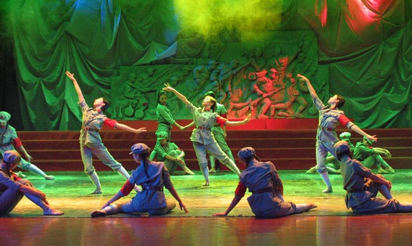 晚会在我院音乐学院师生表演的气势恢宏且豪迈的大合唱《长征组歌》(《过雪山草地》、《报喜》)中拉开帷幕,铿锵有力的节拍敲打着观众的心灵,一开始就将晚会气氛推向高潮。我院戏剧学院学生表演的情景朗诵《长征路上》使全场回荡着经典的红色旋律,那一幕幕革命先烈可歌可泣的英雄壮举,那一幕幕震人心、撼山河的感人场景,仿佛浮现在人们的眼前。我院音乐学院的钢琴协奏曲《黄河》第四乐章——保卫黄河、女生小合唱《十送红军》等节目,再现了中国共产党领导工农红军,披荆斩棘,舍生忘死,取得长征胜利的伟大历程,展现了坚韧不拔,自强不息,勇往直前的长征精神。我院音乐学院的男中音独唱《相依为命的祖国》、戏曲学院《共创辉煌》等节目,则表达了高校师生继承和弘扬长征精神,踏着先辈的足迹扬帆远航,争取新一轮长征胜利的壮志凌云之情。我院舞蹈学院表演的《天边的红云》舒展大气,技艺精湛,她们时而跃起,时而匍匐,把那段血与火的历史表现得淋漓尽致。来自山东师范大学、山东体育学院、山东省青年干部管理学院等高校的师生们也表演了精彩的节目。演出结束后,王修智等走上舞台亲切接见了演职人员,并与大家合影留念。