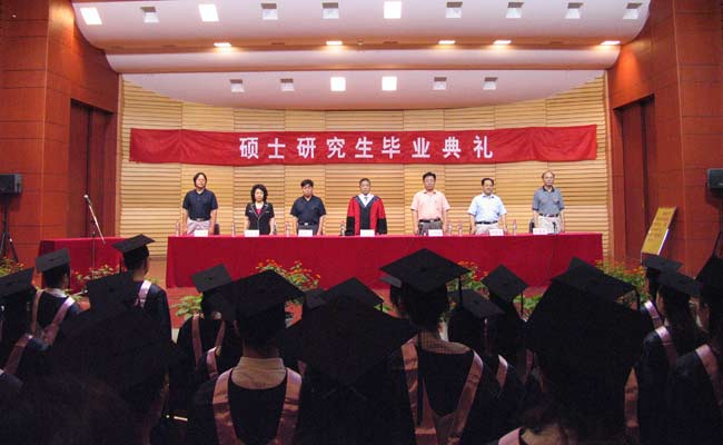 6月29日上午9时,学院综合楼音乐厅里鲜花飘香,热情洋溢,在庄严的国歌声中,我院2006届硕士研究生毕业典礼在这里隆重拉开帷幕。院长张志民,党委副书记朱德强,党委副书记、纪委书记刘致兴,副院长胡德定、郭跃进、江奔东、王力克以及各院(部)、各部门的领导、即将毕业的研究生及其导师和亲友们出席了毕业典礼。典礼由朱德强副书记主持,江奔东副院长作重要讲话。