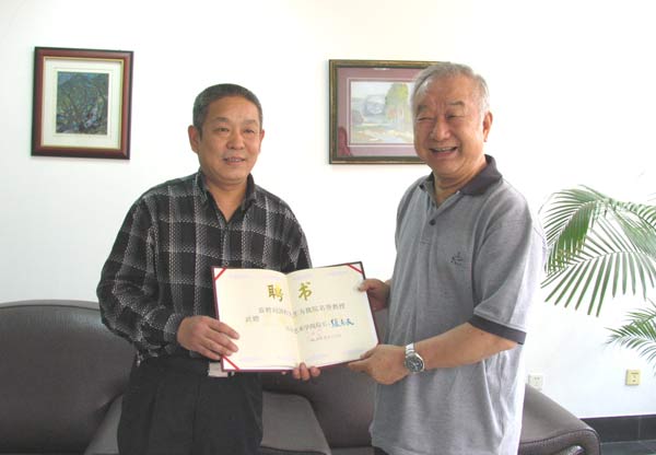 仪式上,大家对他的到来表示热烈欢迎。张志民院长为刘国松先生颁发了聘书。随后,主客双方进行了愉快的会谈。张院长说,今天学院十分荣幸地聘请到了刘先生为客座教授,希望刘先生能接受我们诚挚的邀请,在今后多来山艺做客,多与学院进行学术交流与合作。刘国松先生表示,很高兴来到山东艺术学院,并荣幸地受聘为学院的客座教授,自己十分愿意在今后为家乡的艺术事业尽上绵薄之力。