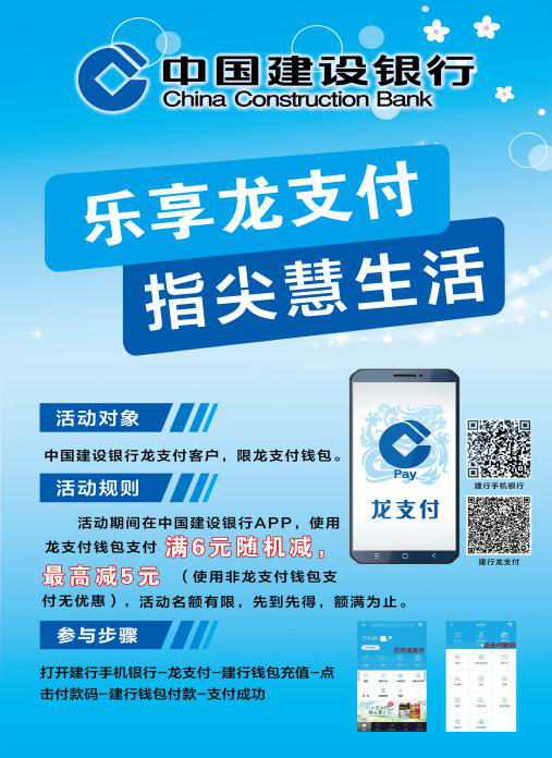建设银行热烈庆祝山东艺术学院60周年华诞,建行济南文东支行特别推出“乐享龙支付 指尖慧生活”优惠活动,龙支付使用方式如下: