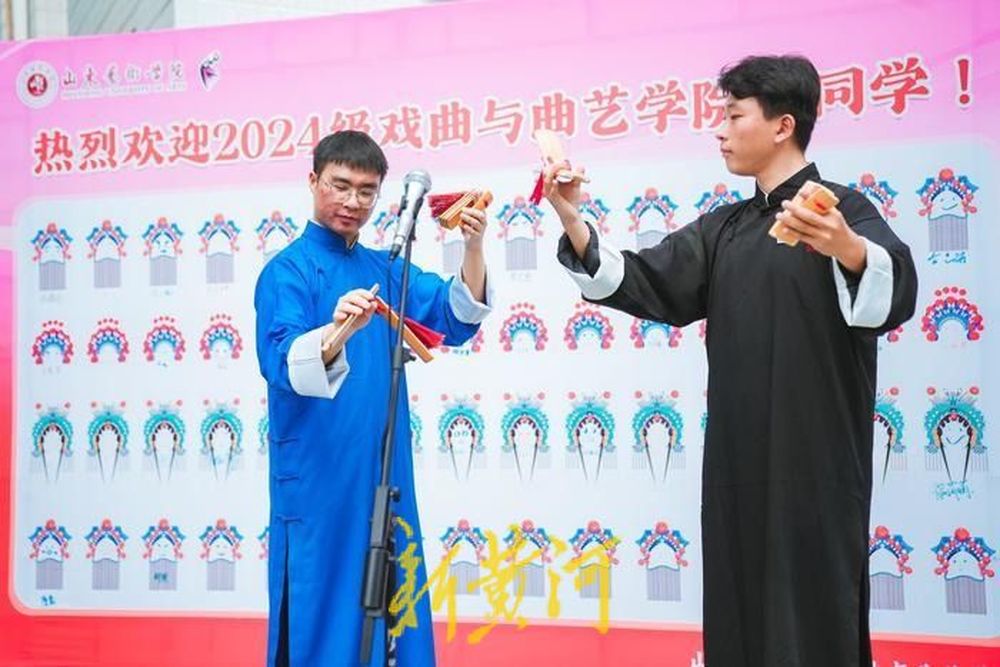 为了向新生展示专业特色,该校多个二级学院组织在校生为新生奉上颇具内涵的迎新“大礼”。戏曲学院在校生表演了快板、吕剧等小段,展示扎实功底;舞蹈学院在校生则为新生送上了民族舞蹈技巧和服饰展示。