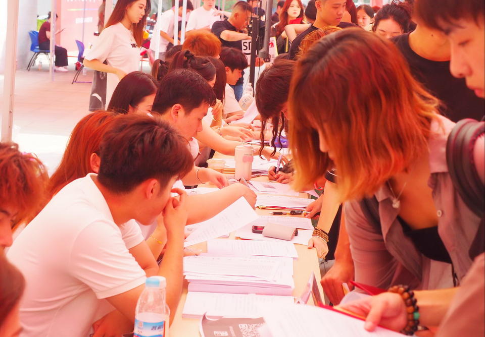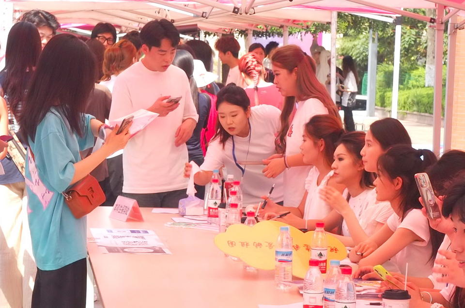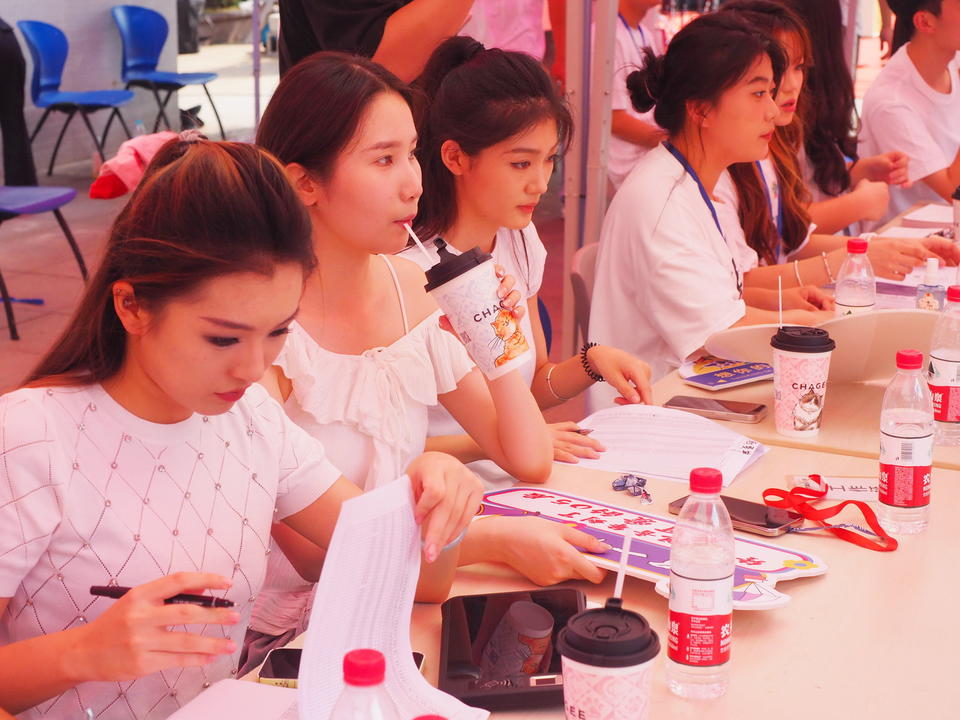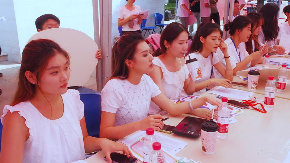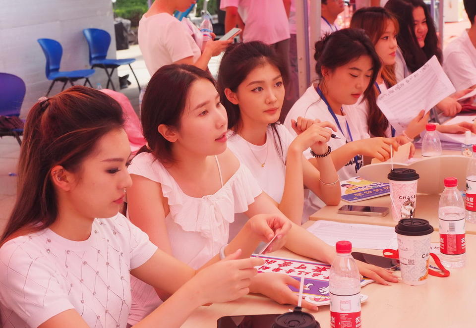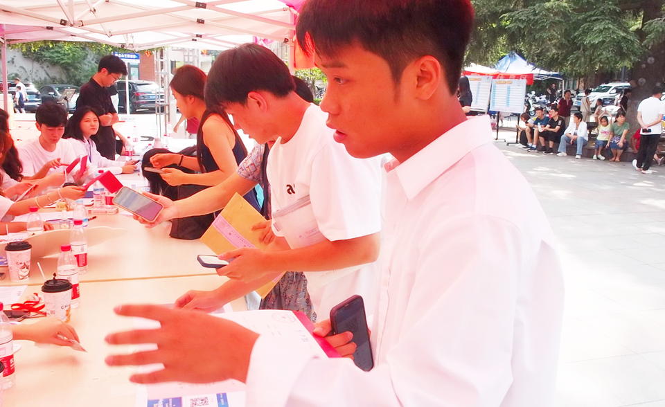 学院派出各个专业的优秀学生接待新生,学姐们的颜值也很高。大家帮着走报到程序、拖运行李、照顾家长,现场一片喜庆祥和的气氛。