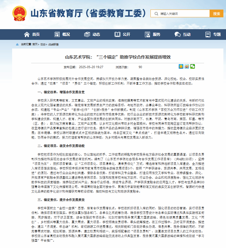 编者按:5月20日,山东省教育厅官方网站“战线联播”栏目刊登我校文章《“三个锚定”助推学校合作发展提质增效》,展示了我校积极拓展对外合作发展空间,持续加大开放办学力度,凝聚整合各类社会资源,深化校地、校企、校际实质性合作,通过“改革”“项目”“责任”三个锚定,积极创新工作机制,不断丰富工作方法,推动学校合作取得实在成效的经验做法。