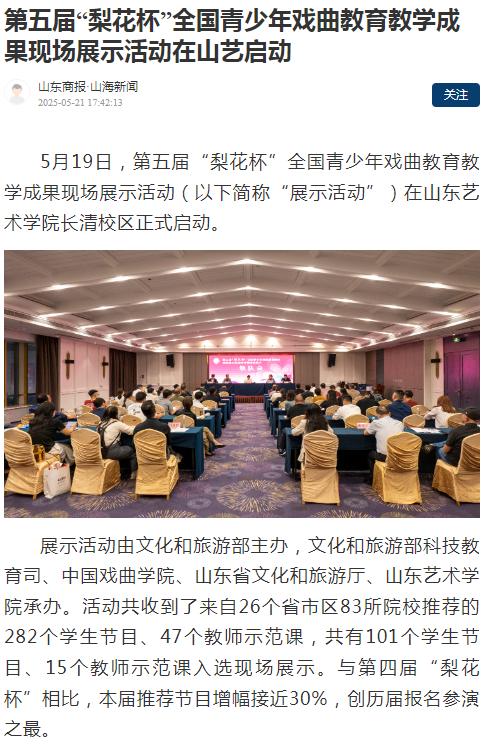 【山东商报·山海新闻】第五届“梨花杯”全国青少年戏曲教育教学成果现场展示活动在山艺启动