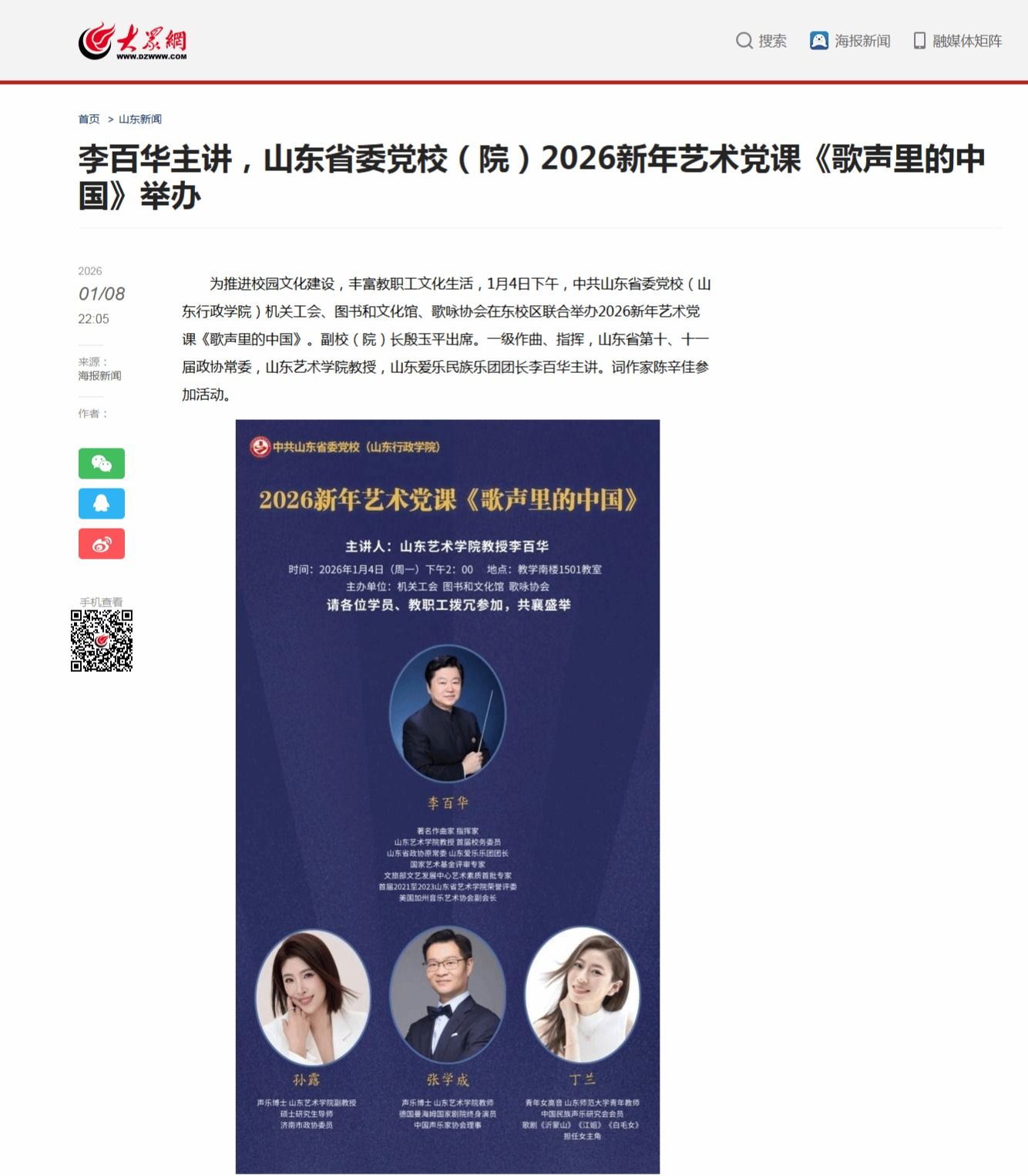 【大众网】李百华主讲,山东省委党校(院)2026新年艺术党课《歌声里的中国》举办
