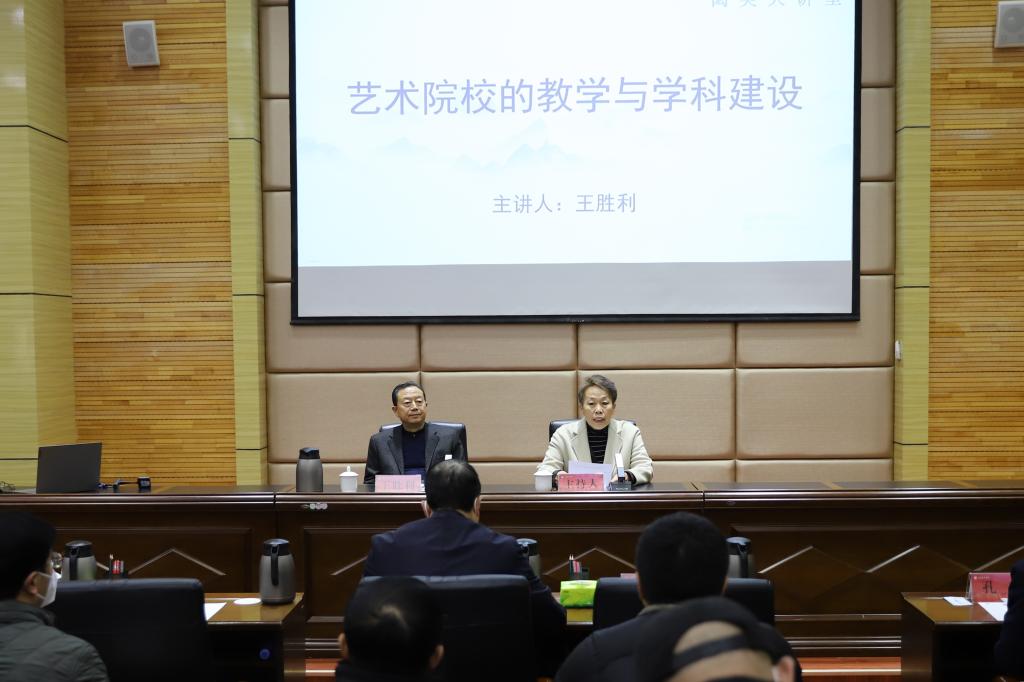 王胜利教授结合自身三十余年的艺术教学及管理实践经验,紧紧围绕艺术院校的教学与学科建设这一主题,从艺术学科发展历史脉络梳理、艺术学科核心竞争力提升、艺术院校教育教学规律探寻以及新形势下博士学位授权点申建等方面进行了深入细致地分析与讲解。他指出,在国家大力推进“双一流”建设的时代背景下,高等院校要以内涵式发展、高质量发展为主线,以学科建设为龙头,持续巩固教学中心地位,突出高端人才培养,不断彰显学科专业特色优势。同时,他还从学科人才梯队建设、名师团队打造、特色方向凝练、高层次人才培养以及标志性成果培育等方面对学校下一步学科建设与博士学位授权点申建工作提出了富有针对性和可操作性的意见及建议。