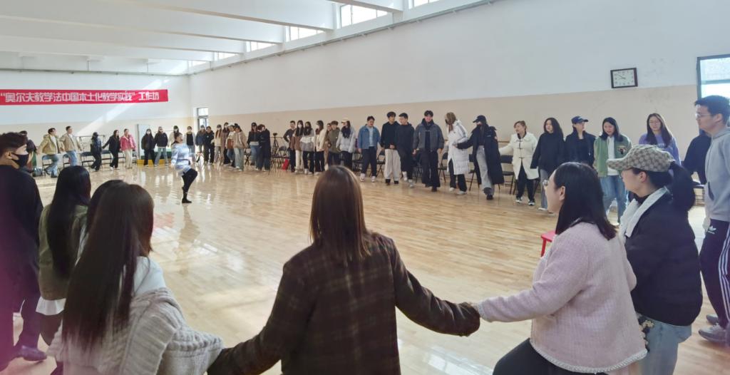 在为期两天的沉浸式教学中,尚永娜结合多年从事理论研究和实践教学的丰富经验,对奥尔夫教学法作了深入讲解,对其本土化教学实践作了多角度分析。她从声势、律动等奥尔夫教学法的基本元素入手,结合当前中小学音乐教育教学中的具体课例,从教师视角到学生视角,从音乐本体教学到审美教育、情操教育、心灵教育等学校美育改革的热点内容,进行阐释论证、分享研究心得,引导师生了解奥尔夫教学法并掌握运用方式。