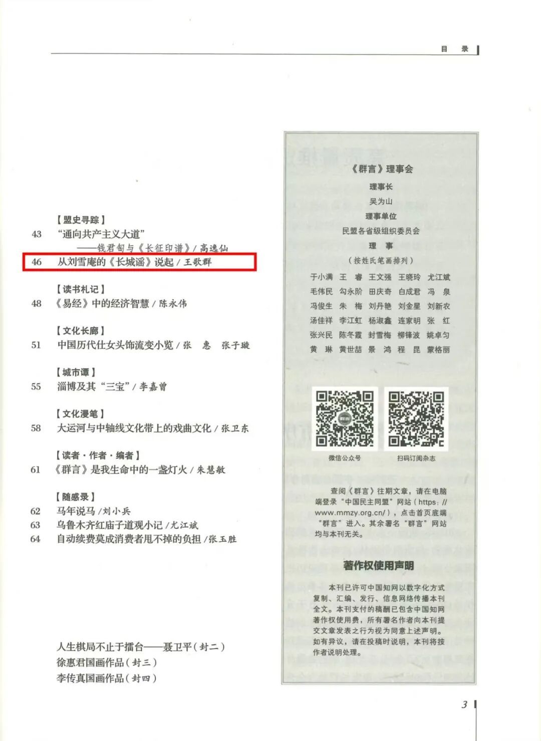 近日,民盟中央主办的杂志《群言》2026年第2期刊发了我校音乐学院院长、民盟中央文化委员会副主任、民盟山东省委会委员、山东省音乐家协会主席王歌群教授的文章《从刘雪庵的〈长城谣〉说起》。