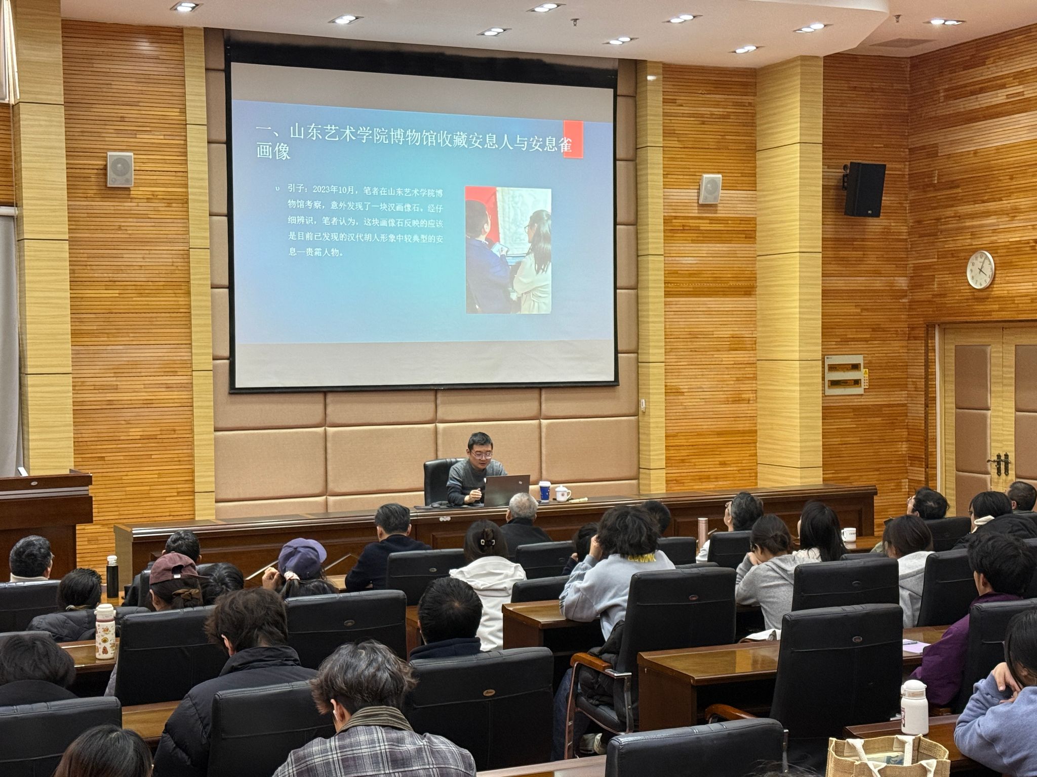 朱浒以扎实的文献考据为基础,结合丰富的实物史料,围绕两大核心研究方向展开深度阐释。他一方面聚焦“山东艺术学院博物馆收藏安息人与安息雀画像”,通过图像与史料的双向互证,深入挖掘汉画像石背后蕴含的多元文化内涵;另一方面以“赵氏孤儿”为典型案例,系统剖析汉画像历史故事的两种图像叙事模式及其形成机制,精准阐释瞬间叙事、连环画叙事等汉画像石核心叙事方式的艺术特征与表达逻辑。整场报告内容详实、逻辑严谨,兼具学术深度与文化内涵,不仅清晰梳理了汉画像石书法题记与历史故事图像的核心研究脉络,更向全院师生传授了金石考据、图像分析的专业研究方法,其前沿的研究视角、专业的研究方法,不仅夯实了一流学科在美术考古、汉画像石等领域的研究基础,更拓宽了学院在国家社科基金项目研究、申报与学术交流方面的视野,为后续相关工作的开展积累了宝贵经验,也为学校书法专业的交叉融合与创新发展提供了重要的学术支撑。