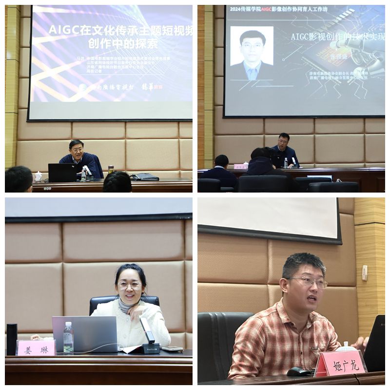 12月16日,传媒学院在办公楼报告厅举办第八届校企协同育人工作坊——AIGC影像创作协同育人坊。工作坊邀请济南广播电视台融合发展中心主任马进、副主任张强盛、采编部副总监姜琳和首席研发工程师姬广龙作为主讲人,传媒学院教授刘强担任学术主持。
