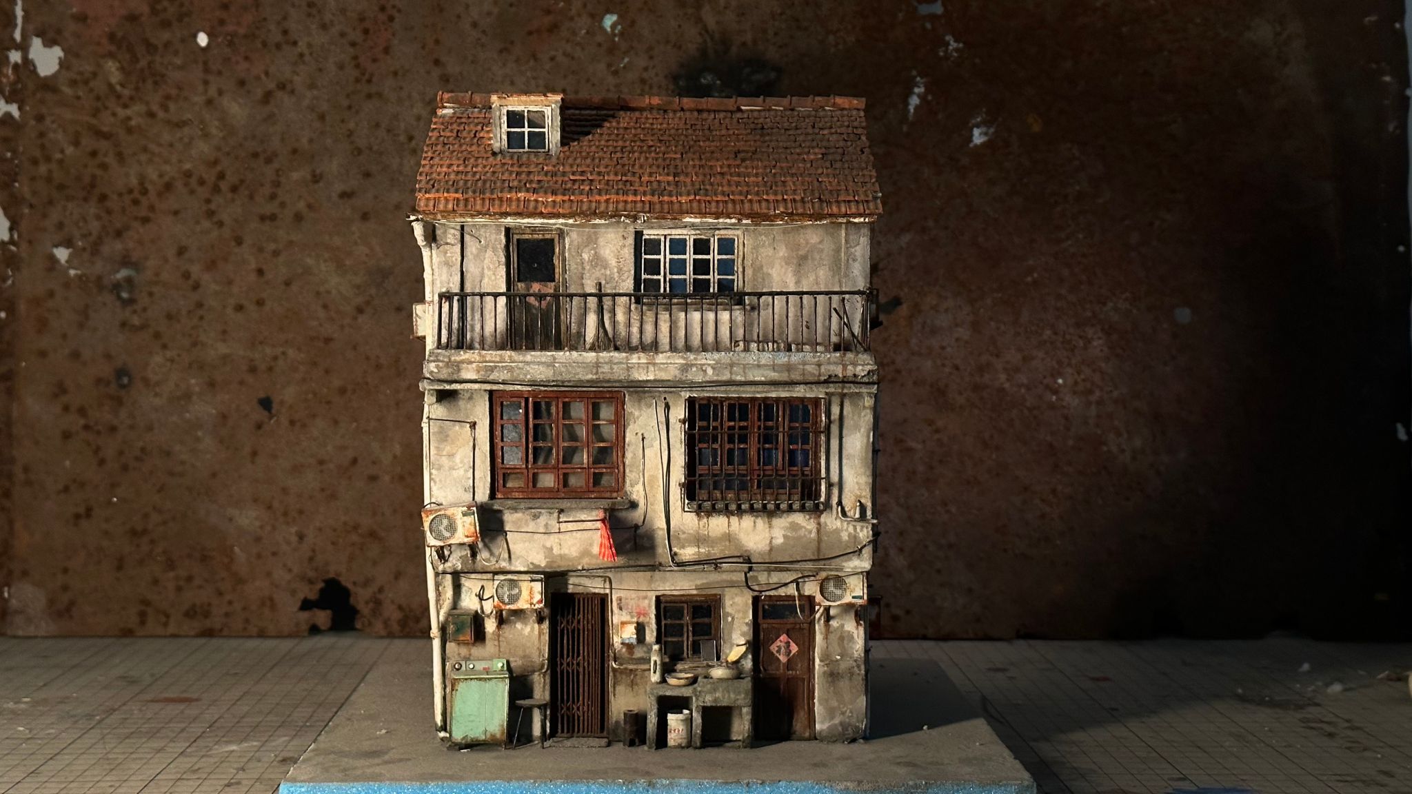微缩模型作品《上海弄堂》创作于2023年(28cm×28cm×32cm)。弄堂不仅是建筑实体,更是几代上海人生活的缩影,承载着市井烟火、邻里温情与历史变迁的记忆。作品聚焦于弄堂中老式建筑、纵横交错的晾衣绳、公用厨房的水斗、狭窄巷道中错落的门窗等典型元素,不仅是物理空间的再现,更是对弄堂集体生活场景的隐喻。墙面刻意做旧的色调与晾晒衣物的色块形成冷暖碰撞,呼应影视美术中“色彩情绪表意”,暗示弄堂生活“破败中的鲜活”。此模型不仅是建筑场景的还原,更是通过细节工艺与符号叙事,将弄堂的烟火气、邻里关系、中西建筑融合等文化内核凝练为可触可感的艺术载体。