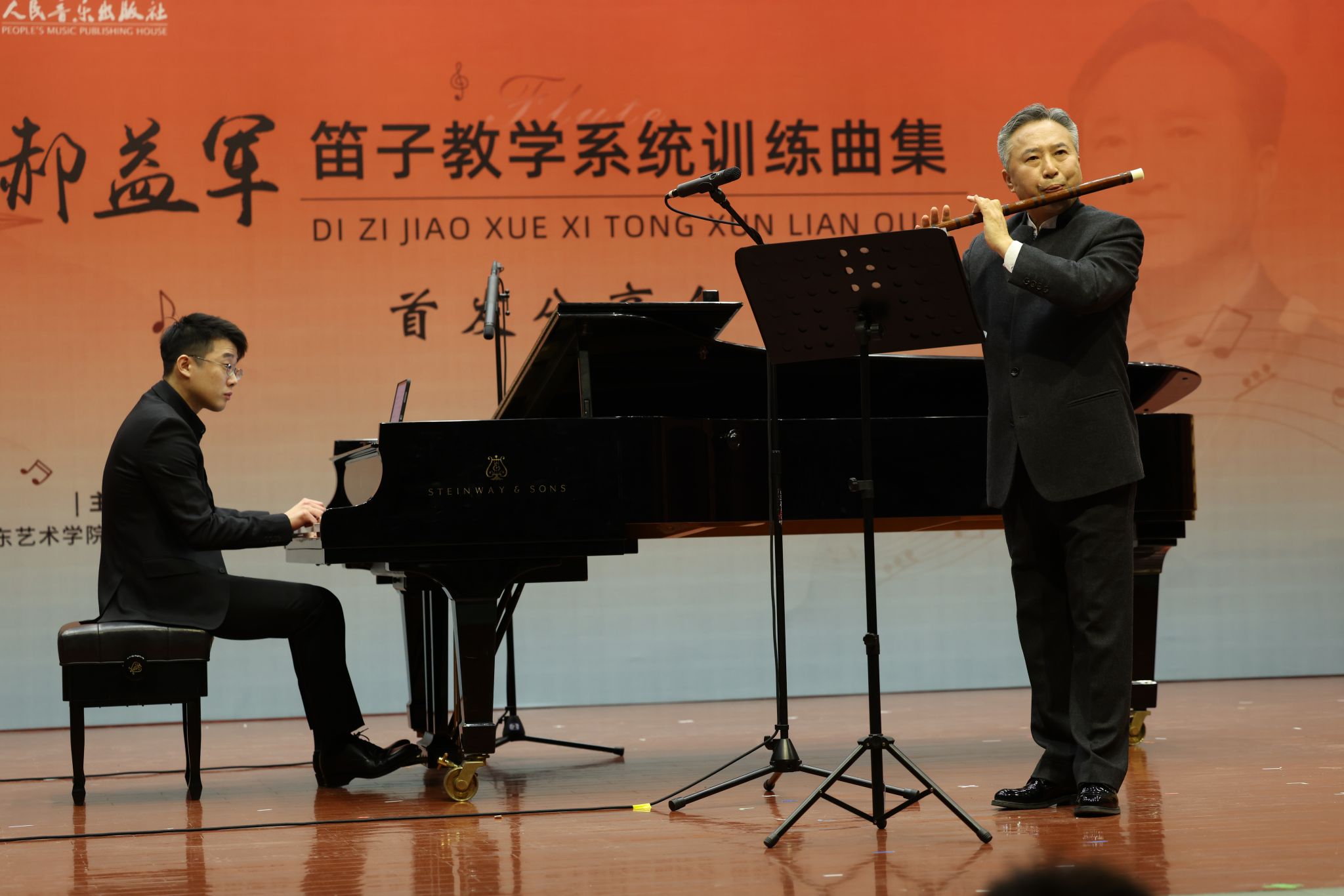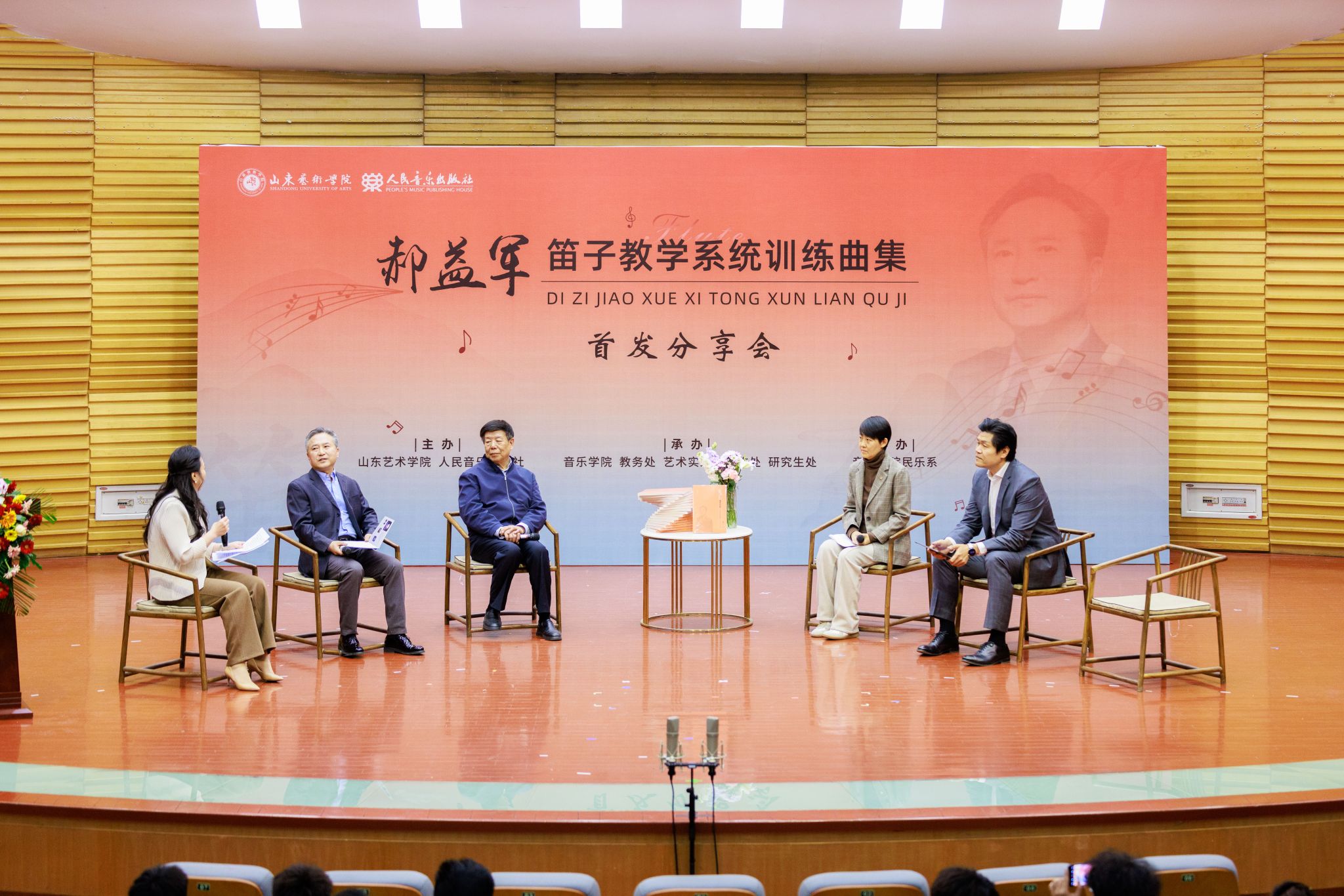 3月29日,音乐学院郝益军教授最新编著教材《笛子教学系统训练曲集》首发分享会在文东校区音乐厅举行。人民音乐出版社副总编辑李向颖,人民音乐出版社第二编辑部主任刘滢,中国民族管弦乐学会党支部书记、中国广播艺术团原团长王书伟,中国民族管弦乐学会党支部副书记、国标委考级标准委员会委员田龙,中国竹笛学会副会长、江苏竹笛学会会长王键,我校音乐学院、艺术实践与创作处负责人及来自全国多所高校竹笛专业人士、音乐学院师生及社会各界音乐爱好者300余人参加分享会。