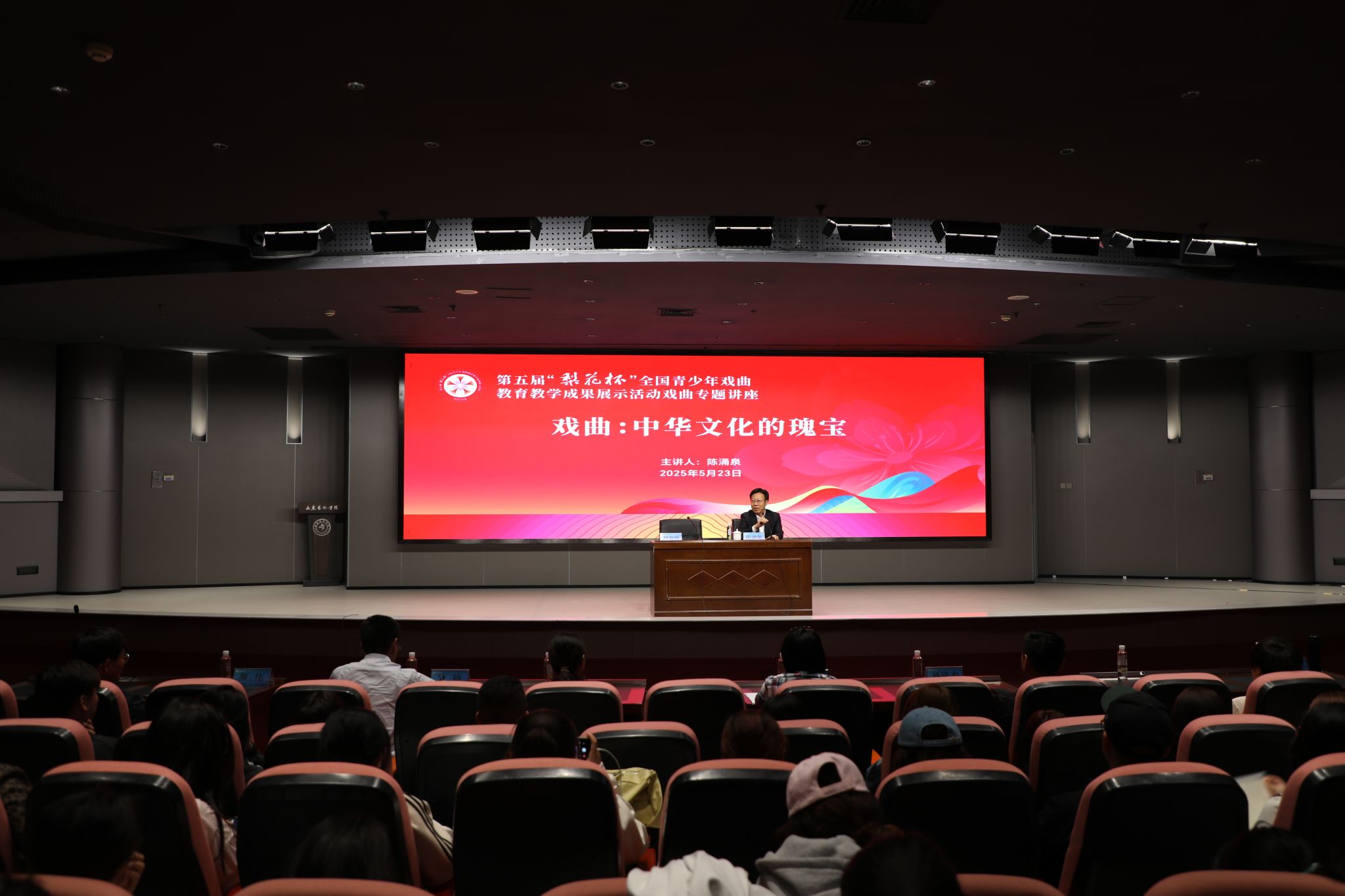 5月23日下午,第五届“梨花杯”全国青少年戏曲教育教学成果展示活动第五场专题讲座在我校长清校区图书馆报告厅举办。中国戏剧家协会分党组书记、驻会副主席,国际剧协副主席陈涌泉应邀作题为《戏曲:中华文化的瑰宝》的专题讲座。校内外师生300余人现场聆听了讲座。