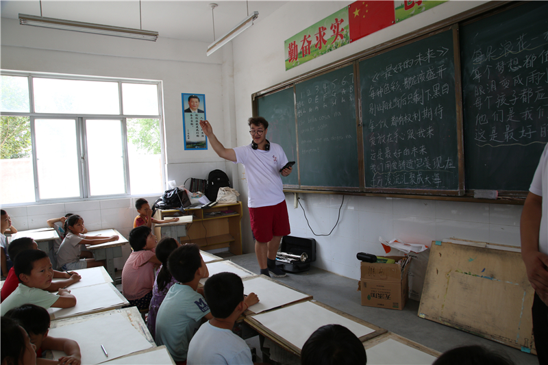 “我叫尼古拉,来自万里之外的德国……”教室里,一位手持小号、金发碧眼的青年正用略显生硬的汉语自我介绍。尼古拉是山东艺术学院大学生暑期社会实践艺术支教团的成员,获悉校团委组织赴黄河滩区第一书记村艺术支教的消息后,尼古拉便通过国际交流合作处联系到校团委,第一时间加入了大学生艺术支教团。在30多度高温的教室里,满头大汗的尼古拉和另外5名小伙伴正投入地为50多位黄河滩区的小学生普及音乐基本知识,教他们唱简单的歌曲。教到兴起时,尼古拉还即兴演奏起他心爱的小号,悦耳的音乐传出了教室,伴着孩子们的掌声、伴着满满的爱心在左庄村的上空久久回荡。山艺大学生教的认真,黄河滩区第一书记村的孩子们学的投入。从“do re mi fa so la si”开始的韵律到歌曲《最好的未来》的学习演唱,孩子们学的有模有样,那一双双渴望的眼神和一个个稚嫩的声音让趴在窗台上围观的家长眼含激动的泪水,也深深触动着每一位实践团成员的内心。教完了音乐教绘画,艺术支教团的大学生使出了浑身解数,听着他们童真的歌声、看着妙趣横生的涂鸦,山艺大学生暑期社会实践团的同学们在汗流浃背中体会到了一种被需要的喜悦。负责美术教学的支教团成员设计学院学生张雅洁说“扶贫先扶智,治贫先治愚。校团委组织我们开展这次艺术教育进乡村社会实践,既是我们了解社会、助力精准扶贫的行动,也是我们奉献自己、展示新时代山艺大学生风采的机会,我觉得不虚此行、收获很大!”。