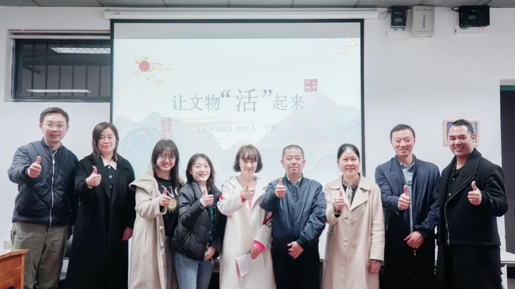活动中,济南广播电视台文旅体育频道制片人、《从河说起》项目制片人于娜以《让文物“活”起来》为题做了分享,介绍了文物活化短视频《从河说起》的创作缘起与艺术特色。她指出,该系列短视频力求通过“文化+科技”“艺术+技术”的创作理念,找准传统文化和现代表达的契合点,从文物角度解读黄河文化。宫晨以《如何将文物“整成”文案》为题,从短视频文案写作角度向同学们做了分享。黄瀚东、许刚结合多年工作经验向同学们分享了文物修复的专业知识。