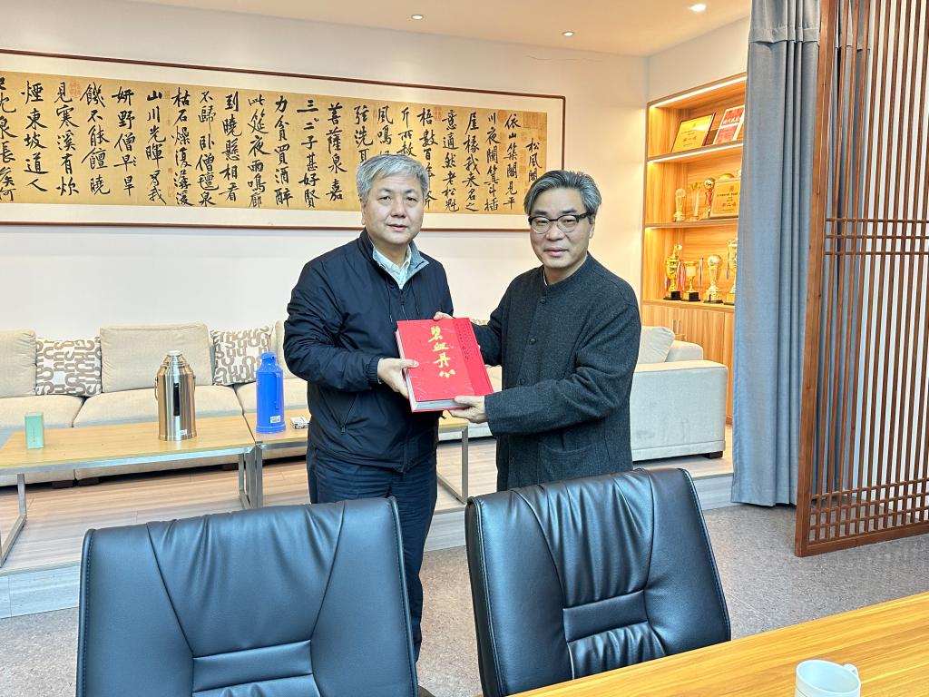顾亚龙代表学校向中国美术学院赠送《山东书法全集》,中国美术学院回赠了《国美之路大典》等教学科研成果文集。考察团在中国美术学院教师带领下参观了《宋韵今辉艺术特展》等展览作品。
