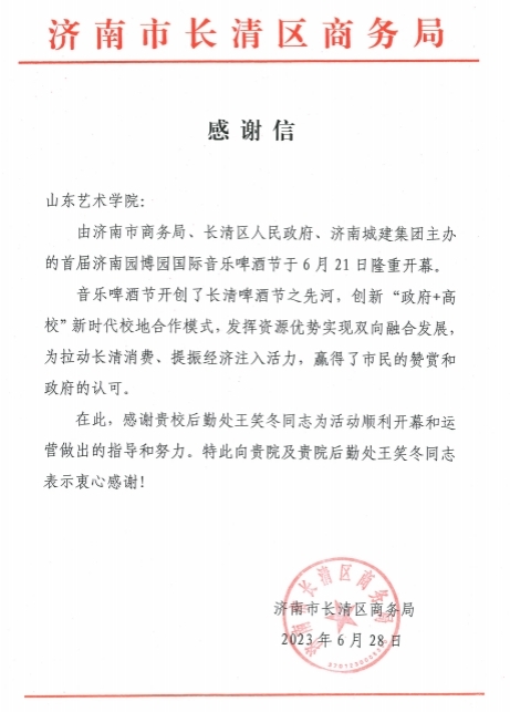 6月29日,我校收到济南市长清区商务局的感谢信,感谢我校后勤管理处王笑冬同志在济南园博园国际音乐啤酒节期间给予的帮助和支持。