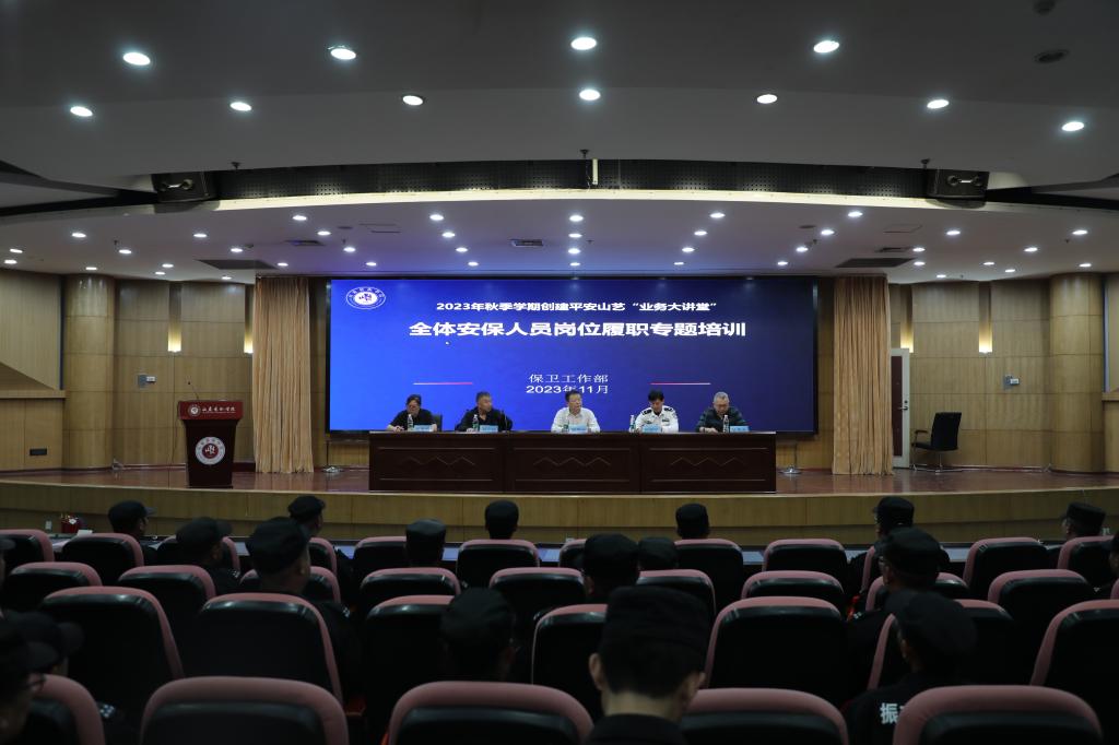 11月1日,保卫工作部在长清校区举办2023年秋季学期安保人员岗位履职专题培训。长清公安分局高校专班政委葛广申,驻校高级警长郭拥军,保卫工作部负责人,山东振邦保安公司西城分公司副总经理张秀娟出席活动。学校全体安保人员参加培训。